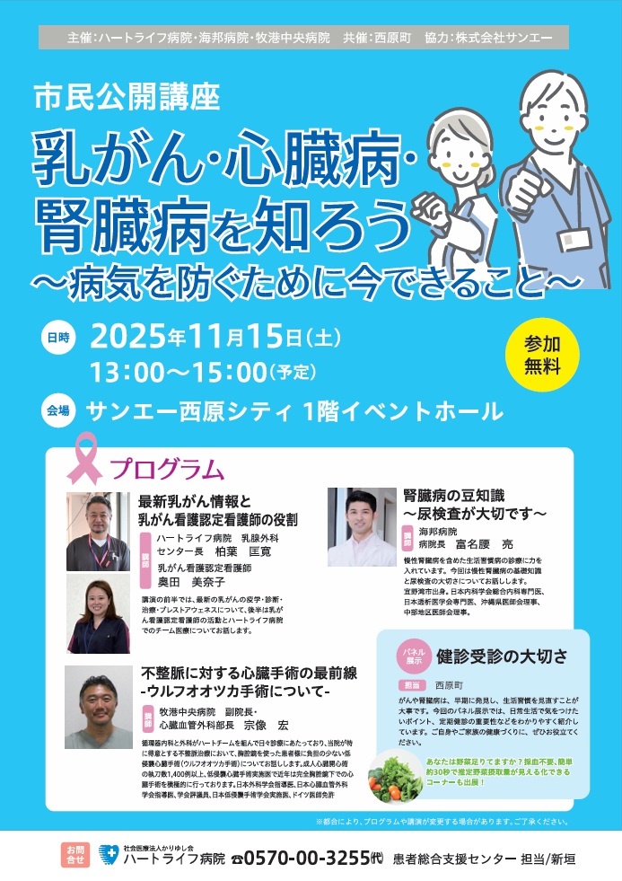 去る10月4日、「乳がん・心臓病・腎臓病を知ろう ~病気を防ぐために今できること~」と題した市民公開講座が開催されました。本講座は、ハートライフ病院、海邦病院、宜野湾市、牧港中央病院の共催で行われ、多く方にご参加頂きました。