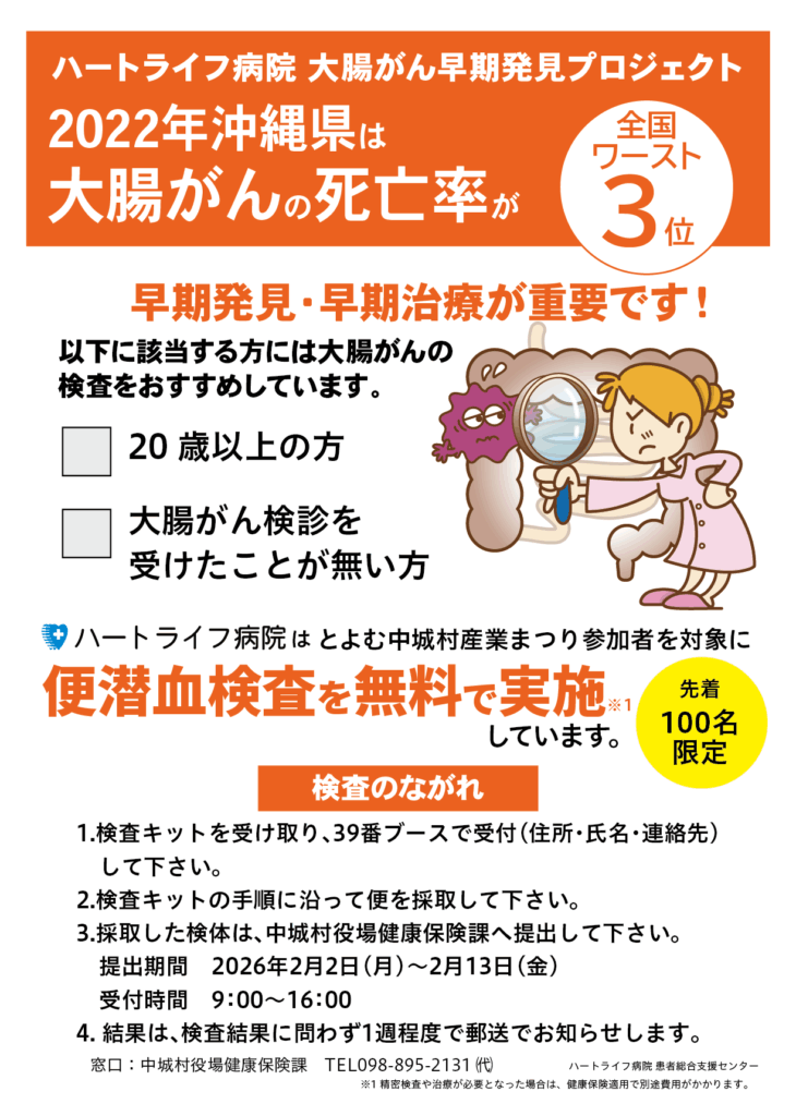 2026年1月31日(土)・2月1日(日)に開催される、3年に1度の「とよむ中城産業まつり」において、便潜血検査キットの無料配布を行います。