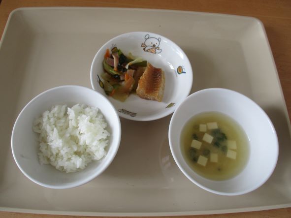 幼児食・後期食:ご飯、赤魚の照り焼き、野菜炒め、みそ汁