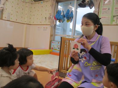 アメニモマケズ…今日のつき組さんほし組さんの子どもたちも元気いっぱいです。朝の会を覗いてみましょう。”先生おはよ♪みなさんおはよう(^^♪”ご挨拶を済ませると、お歌をうたいます。その後は…果物カードを興味深く見ている子どもたちです。