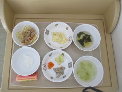 後期食・幼児食:肉みそスパゲッティー、卵サラダ、コンソメ汁