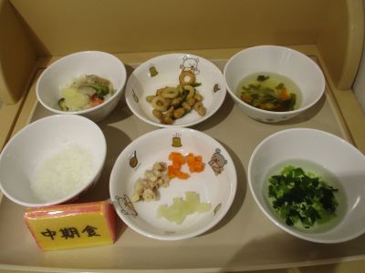 中期食:おかゆ、玉ねぎと人参、鶏肉のだし煮、ほうれん草汁