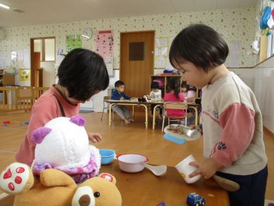 おままごとコーナーでは…イエイ!と思わずポーズのEちゃんです。