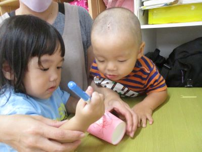 新聞紙あそびの側では、夏まつりのちょうちん作りで紙コップに描いています。