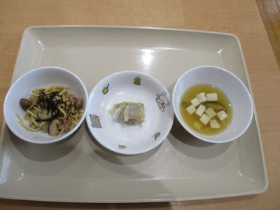 後期食、幼児食:和風きのこスパゲティー、しゅうまい、中華汁