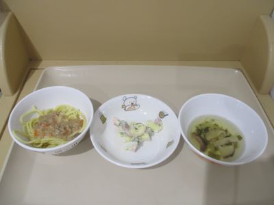 後期食・幼児食:肉みそスパゲッティー わかめスープ マカロニサラダ