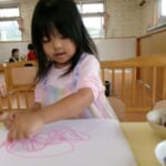Yちゃんは、先生の真似をして、三つ葉の茎の中から繊維を取り出そうと、一生懸命です👀