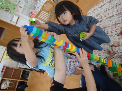 途中から、Sちゃんも一緒に積み上げにはいり、賢いYちゃん先生の膝にも乗りどんどん高く積み上げています。