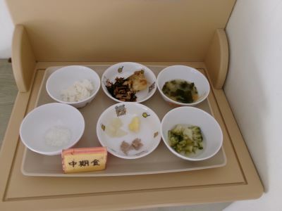 中期食:おかゆ、大根・じゃが芋のだし煮、豚肉のだし煮、汁(ブロッコリー)