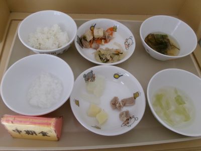 中期食:おかゆ、じゃが芋、玉ねぎ、豚肉だし煮、キャベツ汁
