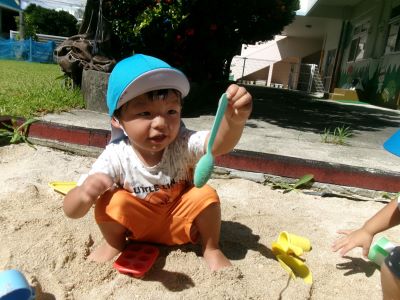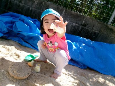 朝に集まりで、「今日は、何して遊びたい?」の返答の第1位のすな遊びこの笑顔見てください(*^▽^*)