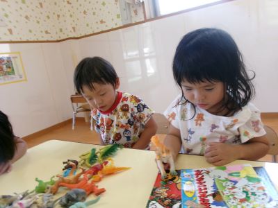 お部屋に戻り、シャワーを浴びてスッキリした後、食事までの時間、絵本、恐竜の玩具で遊びました!