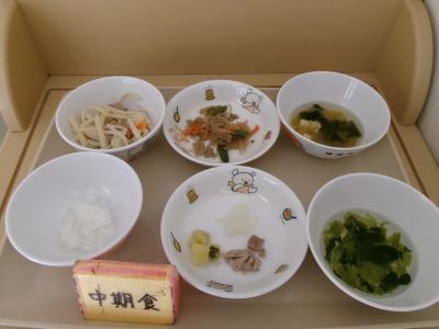 中期食:おかゆ、さつま芋、玉ねぎだし煮、豚肉だし煮、汁(ほうれん草)