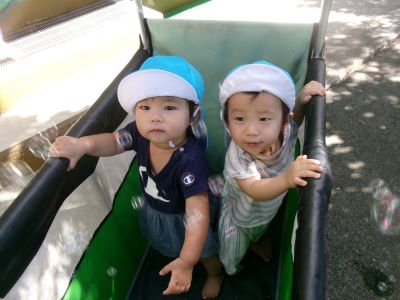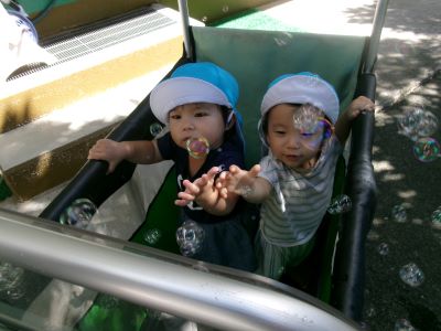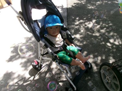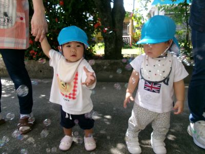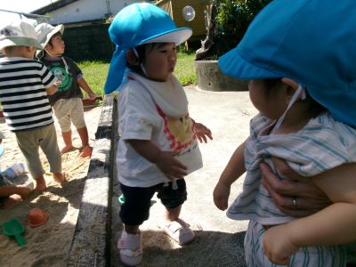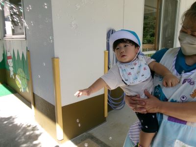 シャボン玉を見て”なんだろ~?”という表情のMちゃん。