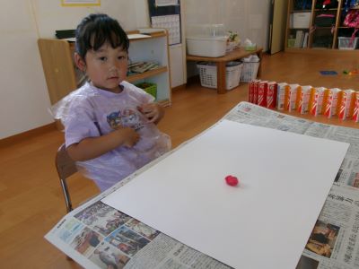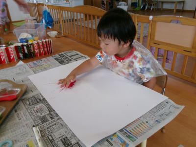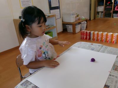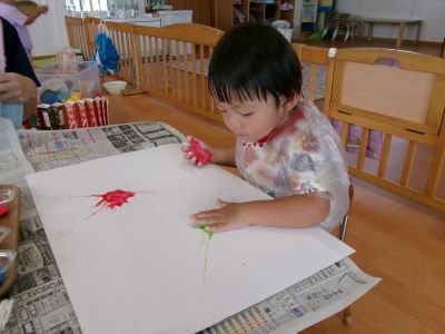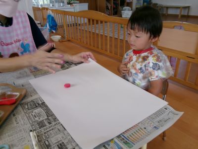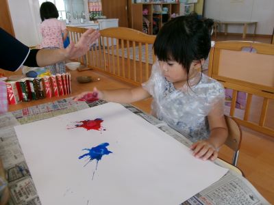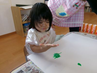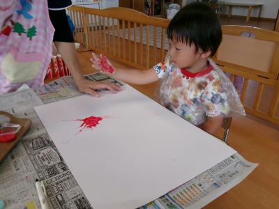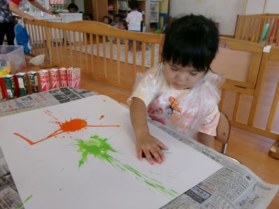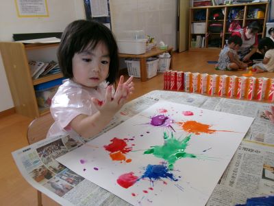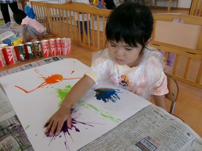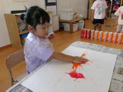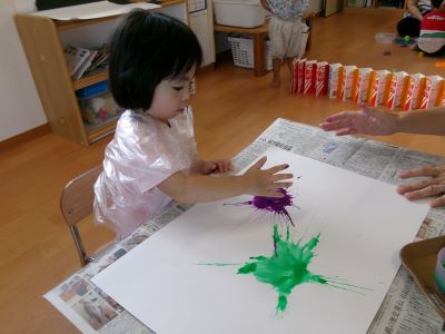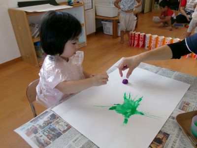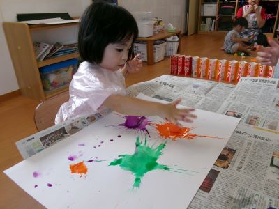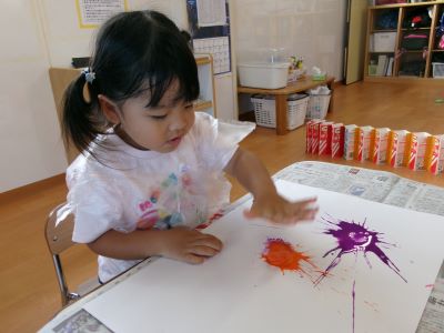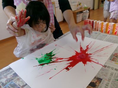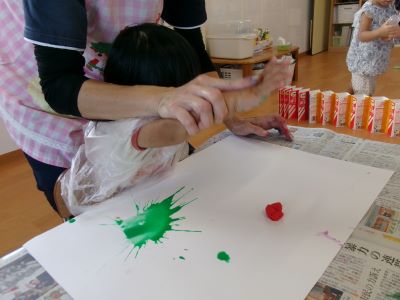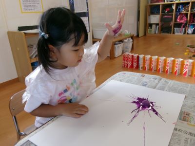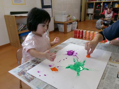 また、少し前に行ったハロウィン製作の様子も紹介します。絵の具を染み込ませた綿を手のひらで叩き、飛び散る模様の広がりを楽しみながら製作に取り組んでいました。