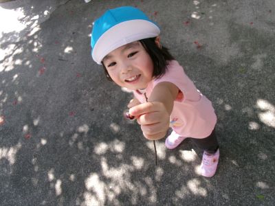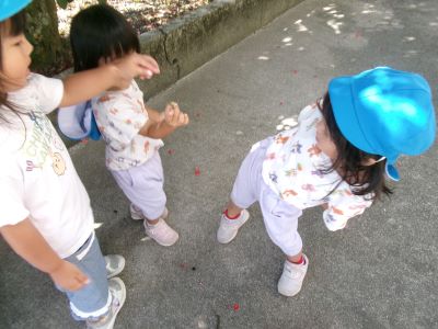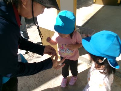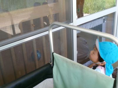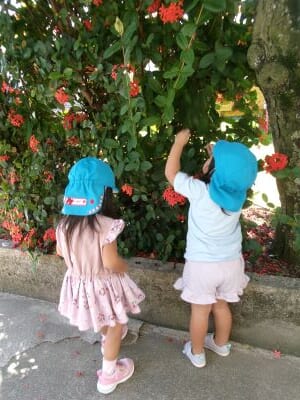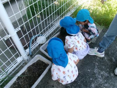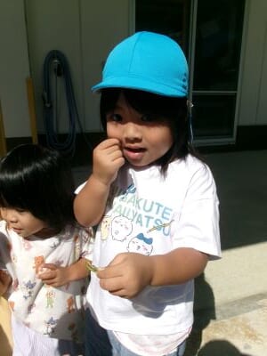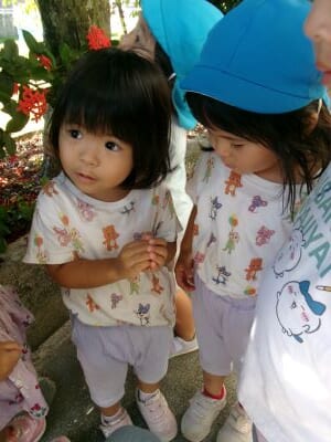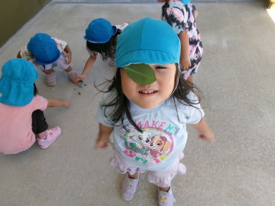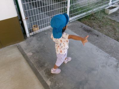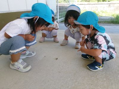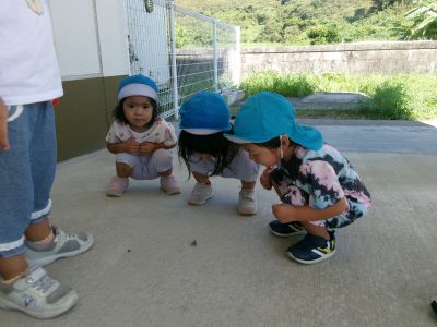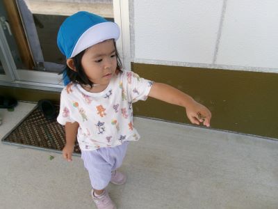 最近は朝に涼しい風が吹き、秋の訪れを感じるようになりましたが、昼間はまだまだ日差しが強く夏の名残も感じられます。今日は園庭ではなく軒下で探索遊びを楽しみ、バッタを見つけて興味津々に観察する子や少し怖がる子など、それぞれの姿が見られました。