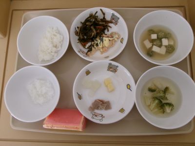 中期食:おかゆ、じゃが芋、玉ネギだし煮、豚肉だし煮、汁(ブロッコリー)