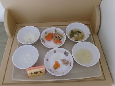中期食:おかゆ、かぼちゃ、玉ねぎのだし煮、鶏肉のだし煮、汁(キャベツ)
