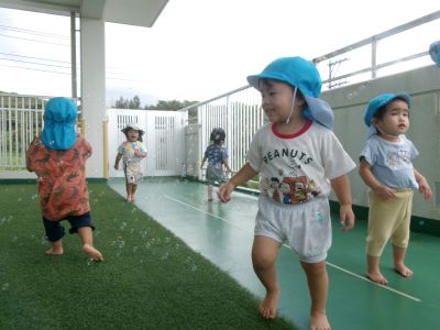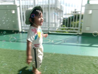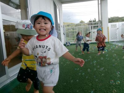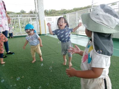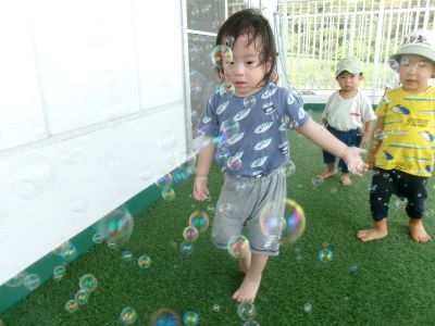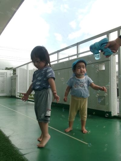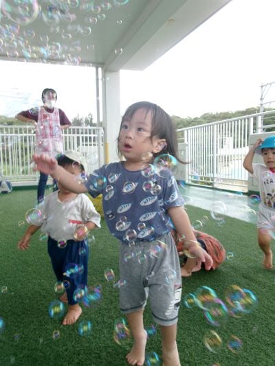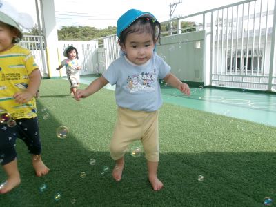 風の強さがあり、あちらこちらに飛んでいくシャボン玉を必死に追いかけるつき組🌙さん😂