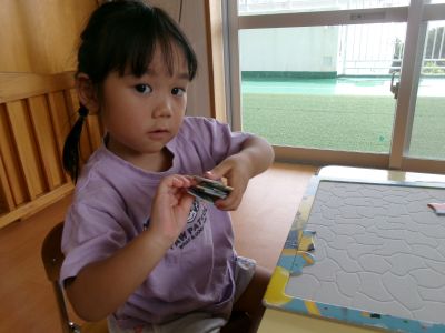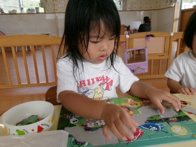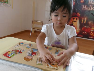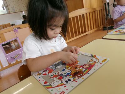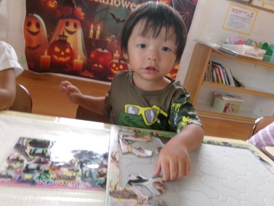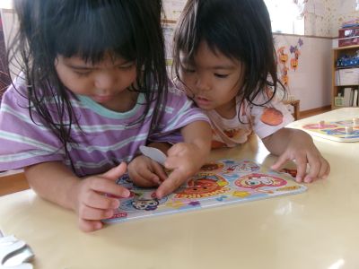 未だまだ、お外で遊びたい子ども達でしたが、お部屋に戻ると、ほし組の子ども達、今、パズルにハマり集中しています(^^♪