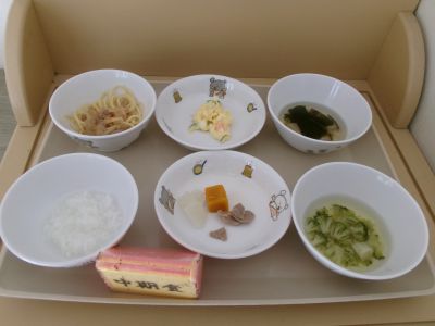 幼児食:肉みそスパゲティー、タマゴサラダ、ワカメスープ