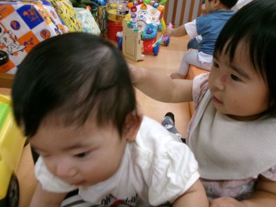 Kちゃんはお友達にいい子いい子して頭を撫でたり…↓