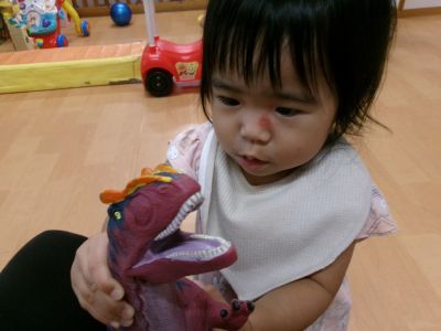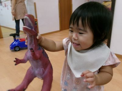 前まで恐竜のフィギュアが怖かったのですが、触れるようになりました!成長を感じます♫少し顔がこわばっていますが…(笑)