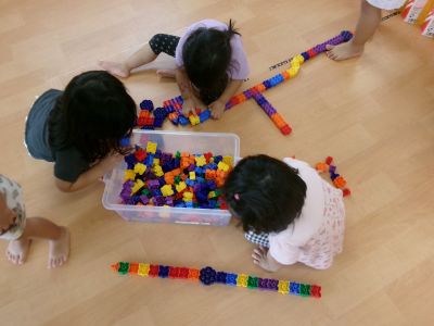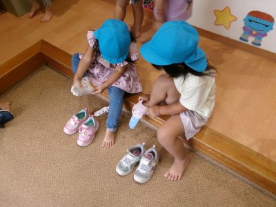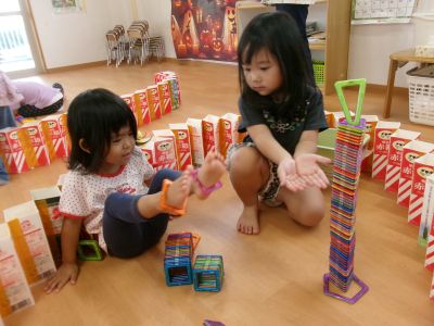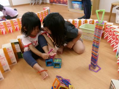 室内遊びでは、好きな遊びを楽しむ様子が見られます。時にはおもちゃの取り合いもありますが、友達と関わりながら遊んでいます。