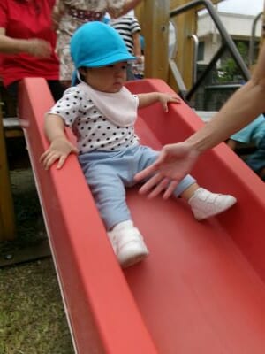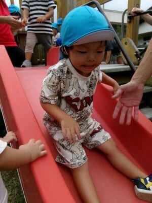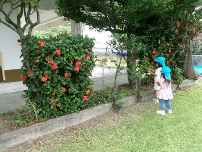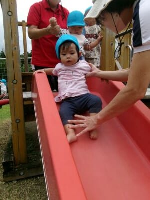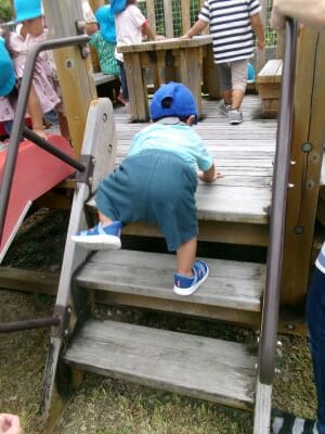 子ども達は整った園庭で走り回ったり、すべり台で体を動かしたり、木の実や花を見つけて集めたりしていました。