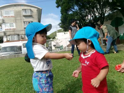 葉っぱ拾いをしていたYくんが、近くに来たNちゃんに「どうぞ」と葉っぱをプレゼント❤