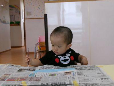 絵筆を持ってぬりぬり🖌やっぱり新聞紙が気になります。