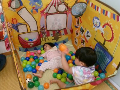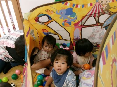ぬりぬりの後は、シアター遊びの他にボールテント遊びです。