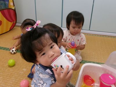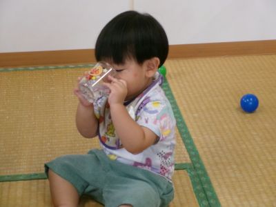 みんなは水分補給タイムです。上手にコップを持ってゴクゴク。
