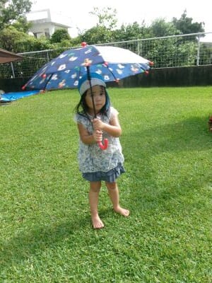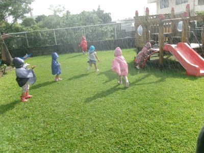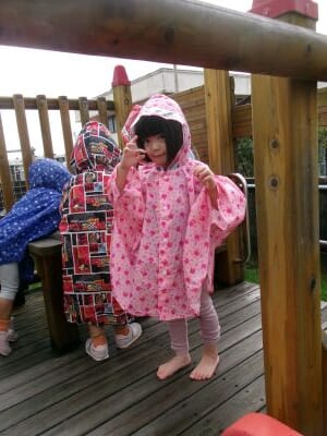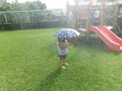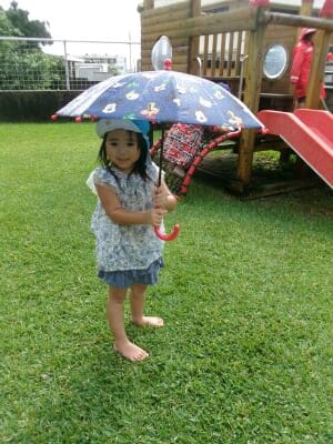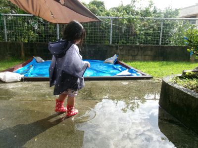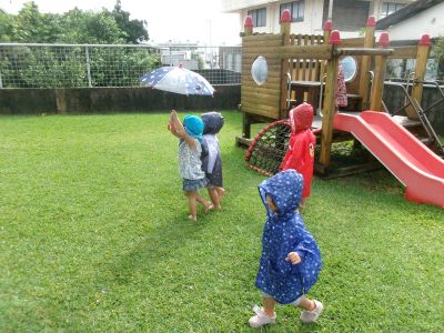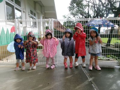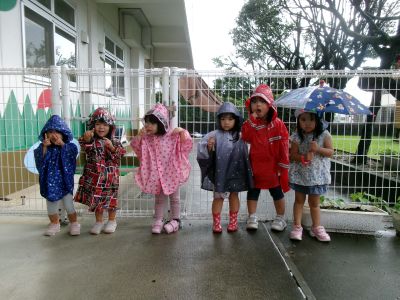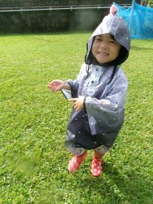 「外で遊べない日が続きそうだなぁ、、、それならいっそ雨を楽しもう!」と計画し、カッパや傘を準備してもらい