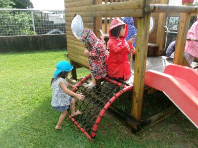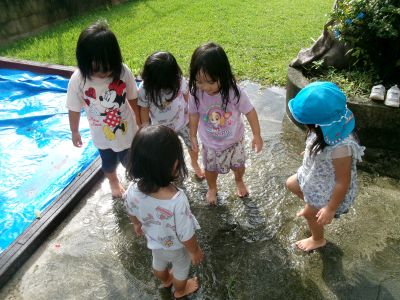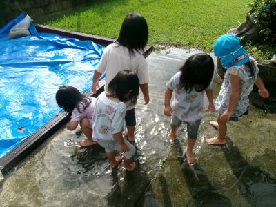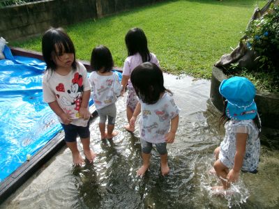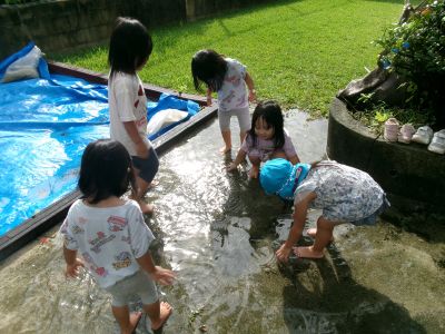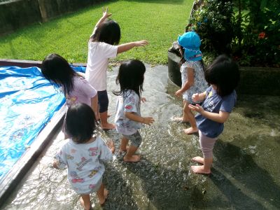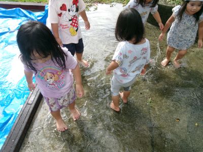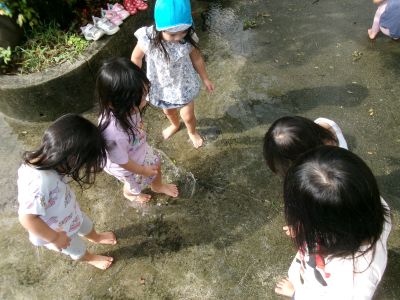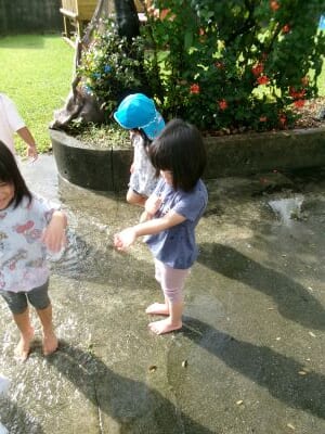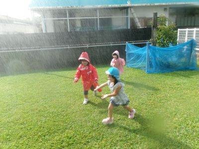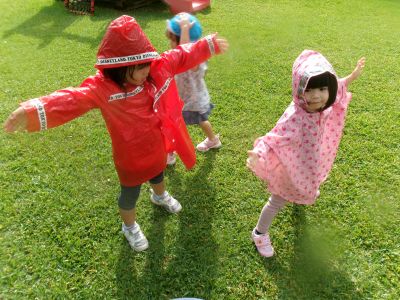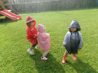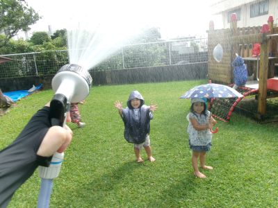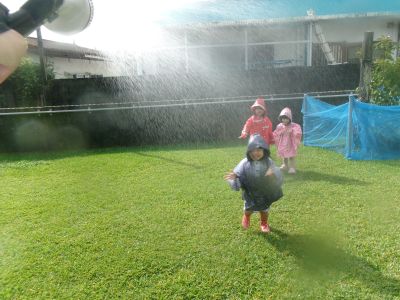 「え~!雨は~?」とちょっぴり残念そうな声もありましたが、保育者がホースで“雨”を降らせると大喜び!
