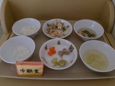 中期食:おかゆ、人参、さつま芋だし煮、豚肉だし煮、汁(キャベツ)