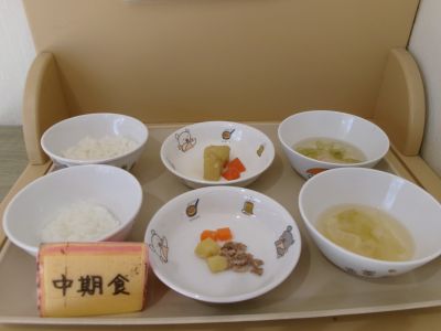 中期食:おかゆ、人参・さつま芋だし煮、豚肉だし煮、キャベツ汁
