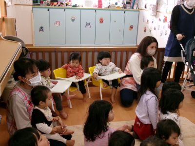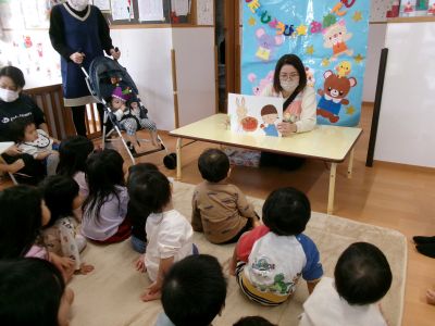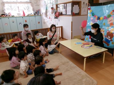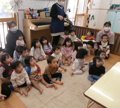 みんなでバースデーソング🎵を歌い、保育者のペープサート、紙芝居をみて楽しく過ごしました(^^♪