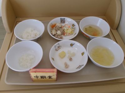 中期食:おかゆ、鶏肉だし煮、さつま芋、玉ねぎだし煮、白菜汁