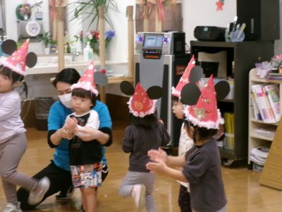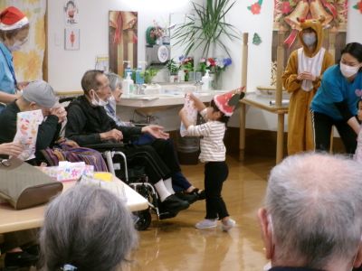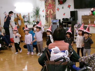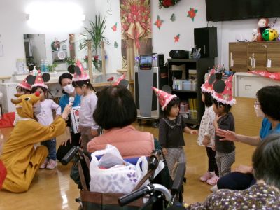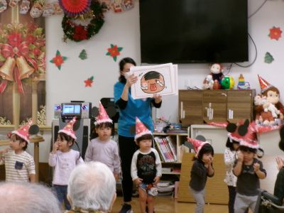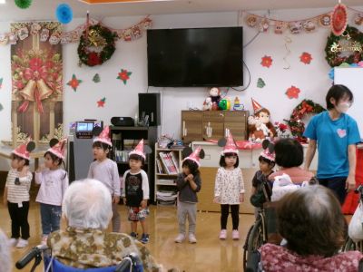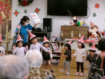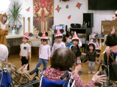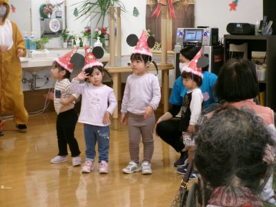 製作で作ったクリスマスの帽子を被り、ダンスを披露♪おじいちゃんおばあちゃん達は、手拍子しながら「上手だね!」「可愛いね❣」と嬉しそうに笑顔で見守ってくれました❣