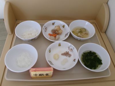 中期食:おかゆ、大根、じゃがいも、豚肉の煮物、ほうれん草汁