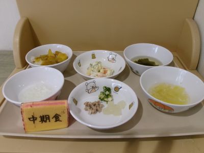 中期食:おかゆ、ブロッコリー・大根だし煮、キャベツ汁