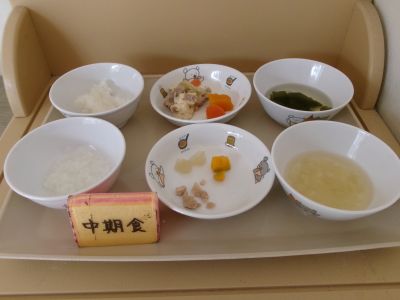 中期食:おかゆ、鶏肉だし煮、キャベツ、かぼちゃのだし煮、