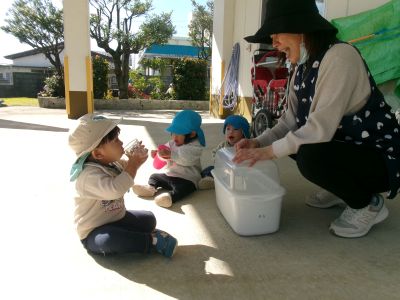 2歳児クラスのおともだちに混ざって遊んだり・・・