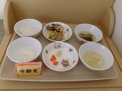 中期食:おかゆ、豚肉だし煮、人参、玉ねぎだし煮、キャベツ汁