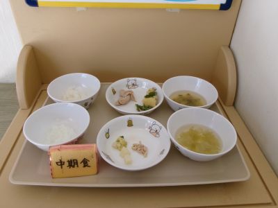 中期食:おかゆ、鶏肉、じゃが芋、ブロッコリーのだし煮、キャベツ汁