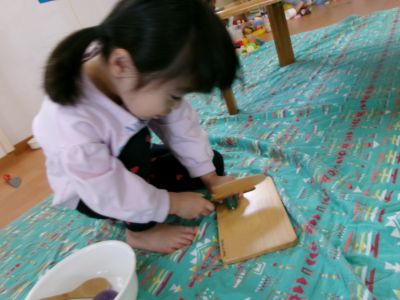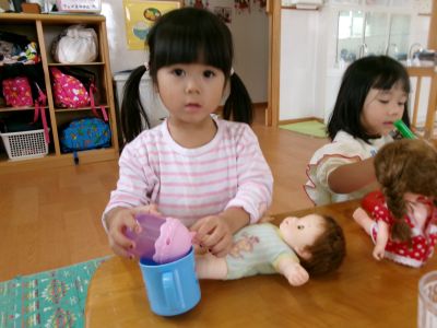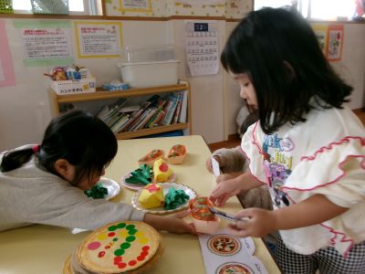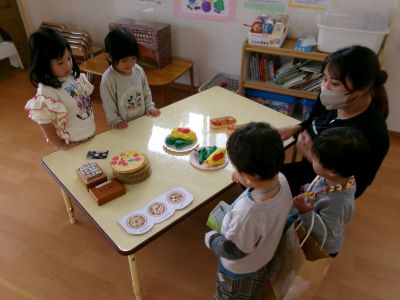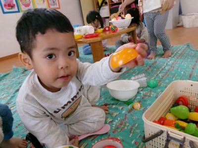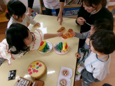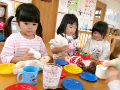 お店屋さんごっこの練習が終わると、みんなでままごと遊びをしました(^^♪
