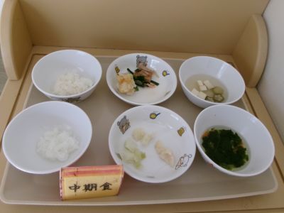 中期食:おかゆ、キャベツ、カリフラワーだし煮、ほうれん草・人参汁