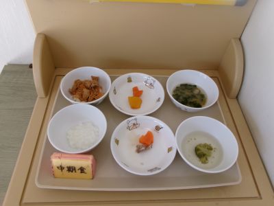 中期食:おかゆ、豚肉だし煮、大根、人参のだし煮、汁(ブロッコリー)