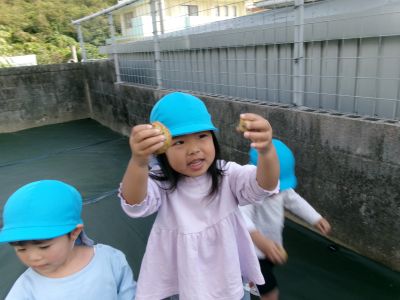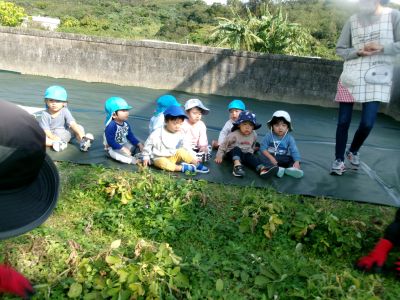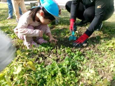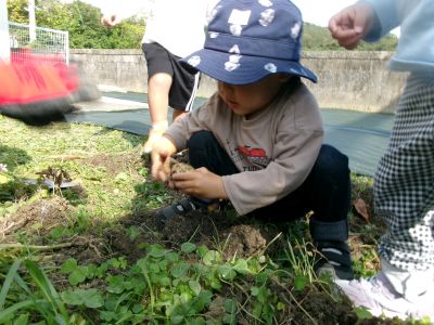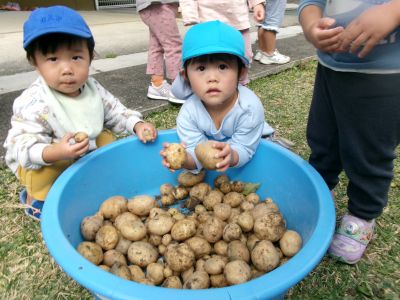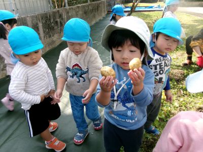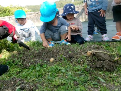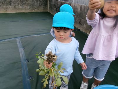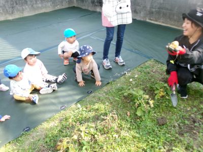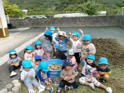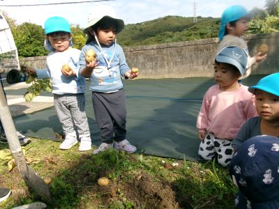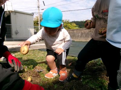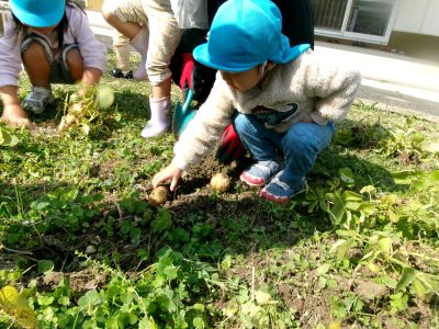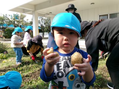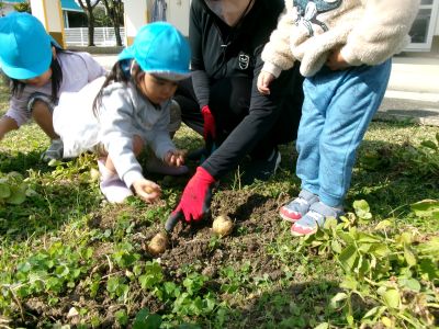 こんにちは!はーとらいふ保育園スタッフのIです。今日は、昨年の11月4日に植えたじゃが芋をつき組、ほし組さんでじゃが芋掘りをしました。土の中からひょっこり出てきたじゃが芋を大喜びで手に取り宝探しのように夢中になってくれました。